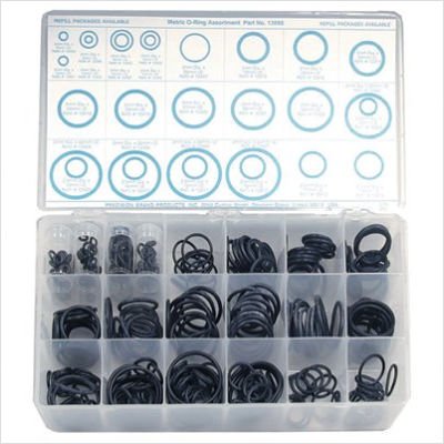 Precision Brand's 350 Piece Metric O Ring Assortment contains: 15 - 2mm x 3mm; 15 - 2mm x 4mm; 15 - 2mm x 5mm; 15 - 2mm x 6mm; 15 - 2mm x 8mm; 15 - 2mm x 10mm; 15 - 2mm x 12mm; 10 - 2mm x 14mm; 10 - 2mm x 20mm; 15 - 2.5mm x 10mm; 15 - 2.5mm x 12mm; 15 - 2.5mm x 14mm; 15 - 2.5mm x 15mm; 15 - 2.5mm x 16mm; 10 - 2.5mm x 17mm; 10 - 2.5mm x 19mm; 15 - 3mm x 19mm; 15 - 3mm x 20mm; 15 - 3mm x 22mm; 15 - 3mm x 24mm; 10 - 3mm x 25mm; 10 - 3mm x 27mm; 10 - 3mm x 28mm; 10 - 3mm x 30mm; 10 - 3mm x 32mm; 5 - 3mm x 33mm; 5 - 3mm x 35mm; 5 - 3mm x 36mm; and 5 - 3mm x 38mm.