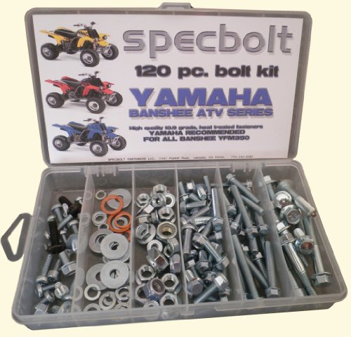 This Specbolt 120 piece kit will save you many trips to the dealership for that special OEM fastener needed for your Yamaha BANSHEE. Your Bolt Kit will include just the right amount of factory match flange bolts, flange nuts, lock nuts, sealing washers, fender washers, plastic push rivots, wide head phillips screws, and more. Most everything you need to perform basic maintainence and upkeep to your Quad. Assortment of bolts for plastic, fenders, bodywork, engine, frame, seat, fuel tank, controls, carburetor, exhaust, pipe, silencer, radiators, handlebars, swingarm, skid plates, bumpers and more. These fasteners meet or exceed quality standards of your machine's originals. A perfect addition to the racer's tool kit and a must have for the do-it-yourself mechanics.